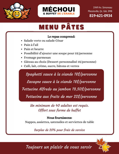 Pour les célébrations de fin d'année, notre menu temps des fêtes inclut ragoût de boulettes, poulet désossé, pâté à la viande, purée de pommes de terre, crudités, et bûche de Noël ou tarte aux pommes. Le buffet est disponible dès 20 personnes, avec livraison offerte à partir de 40.